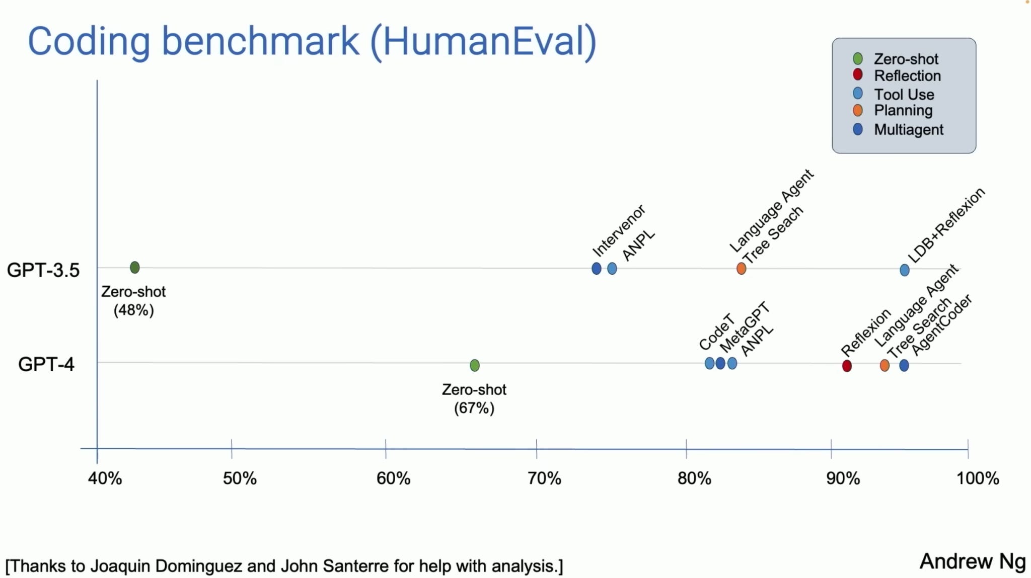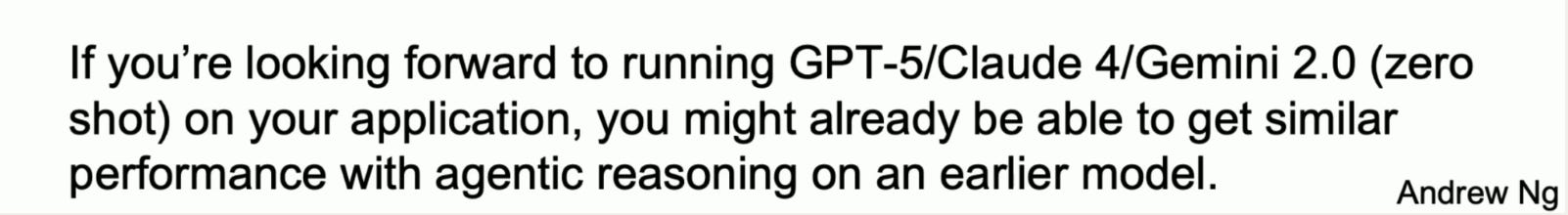 Therefore, Andrew Ng concluded that before using GPT-5/Claude4 in the future, you might achieve similar performance with GPT-4, GPT-3, and other earlier models by incorporating an agentic workflow.