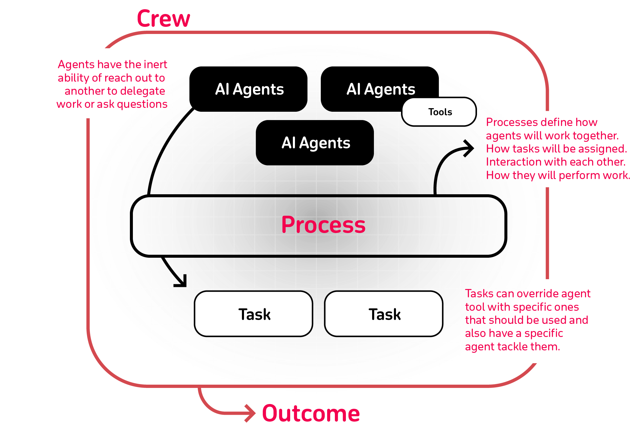 Agents can use tools. When multiple agents are combined and assigned roles and tasks, they form a crew, which can then be directly called upon to address problems.