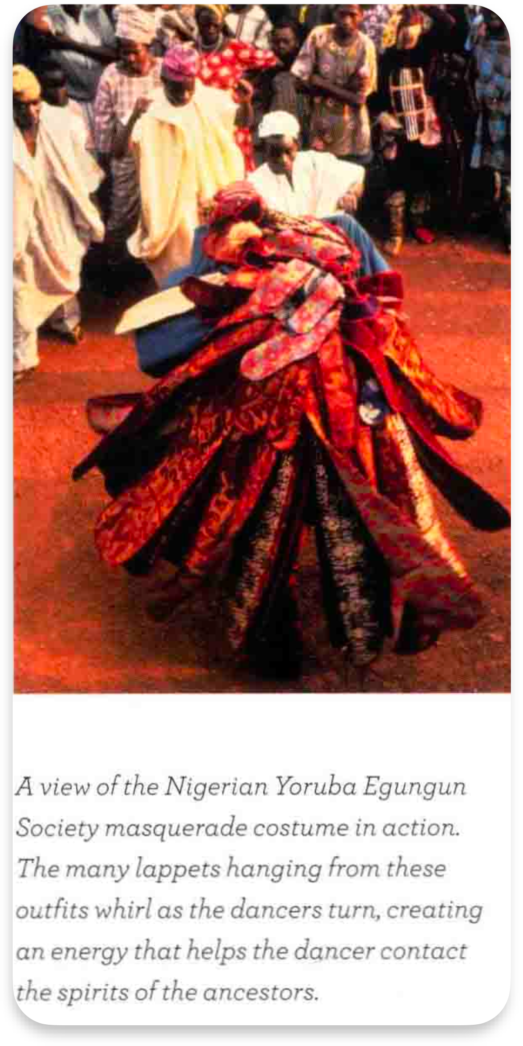 In the masked dances of Nigeria's Yoruba Egungun Society, flowing fabric curtains enhance the ritual power of connecting with ancestral spirits, with the fabric whirlpools created during spinning helping dancers enter the spirit world.